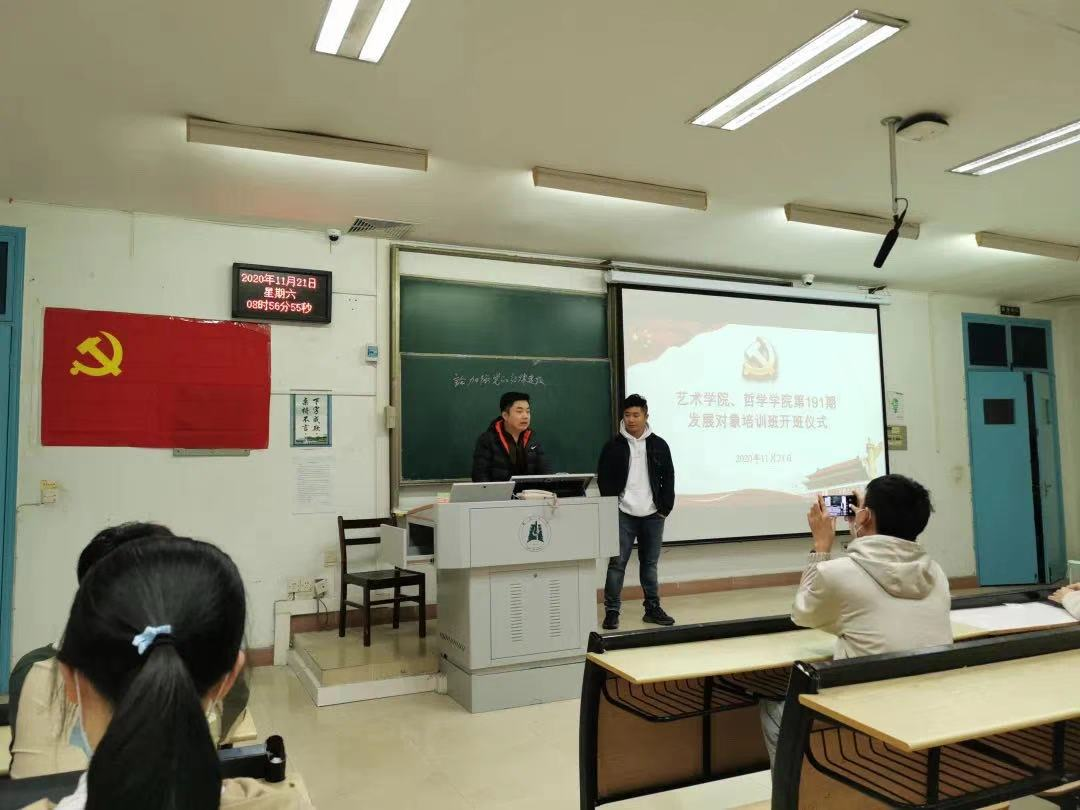为加强对党员发展对象的教育培训,结合“不忘初心、牢记使命”主题教育,引导发展对象进一步学习贯彻习近平新时代中国特色社会主义思想的理论体系,深刻把握习近平总书记系列重要讲话精神,始终在思想上行动上与党保持高度一致,yl7703永利分党校、艺术学院分党校于2020年11月21日上午9点,在四号教学楼307教室举行了第191发展对象培训班,yl7703永利团委书记董力、艺术学院团委书记杨珂以及yl7703永利、艺术学院全体发展对象培训班成员参加此次开班典礼。